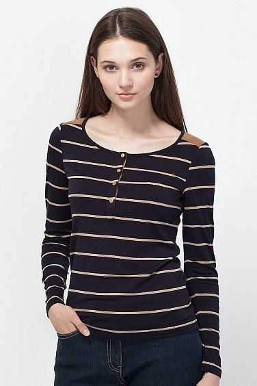 Тонкий трикотажный джемпер из вискозы. Приталенный силуэт, застежка на планку на небольших золотистых кнопках. На плечах декоративные вставки из иск. замши.