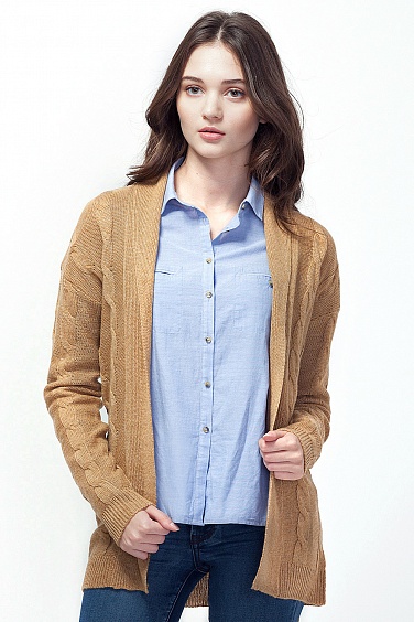 Легкий и теплый жакет с поясом из мягкой и теплой пряжи с добавлением мохера. Вязка косами. Отложной воротник - шаль.
