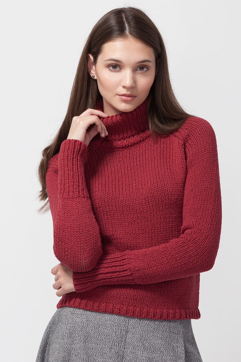 Укороченный свитер связан из толстой хлопковой нити. Объемный ворот, манжеты и низ свитера связаны эластичной вязкой резинка.