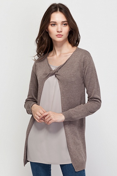 Удлиненный жакет тонкой вязки. Спереди состоит из двух слоев - нижний слой из полуматовой атласной ткани с небольшой сборкой по горловине. Верхний вязаный слой жакета спереди украшен декоративным перекрученным узлом.