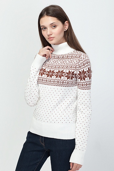Свитер из мягкой и теплой хлопковой пряжи с добавлением акрила, который обеспечивает яркость красок, вязка средней плотности. Верхнюю часть свитера украшает контрастная вязка снежинки.