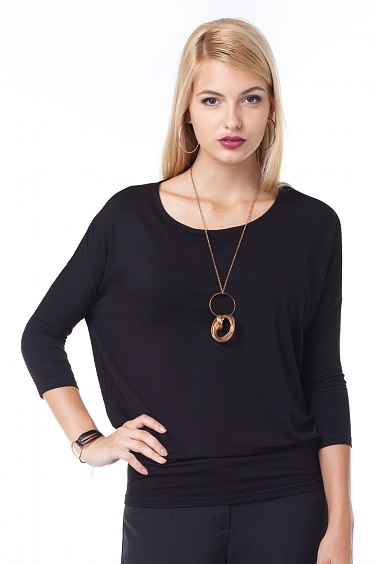 Тонкое вискозное трикотажное полотно. Узкий рукав в спущенной пройме "летучая мышь" длиной 3/4. Свободный силуэт вверху и плотное прилегание на уровне бедер.