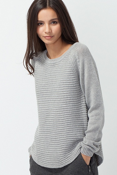 Джемпер крупной вязки изготовлен из мягкой, теплой пряжи с добавлением мохера. Горизонтальная вязка по низу заканчивается полукругом. Рукава реглан.