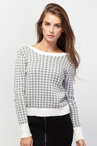 Джемпер плотной двухцветной вязки из хлопка. По плечам и горловине проходит широкий однотонный лампас. Горловина, манжеты и низ связаны вязкой резинка из однотонной пряжи.