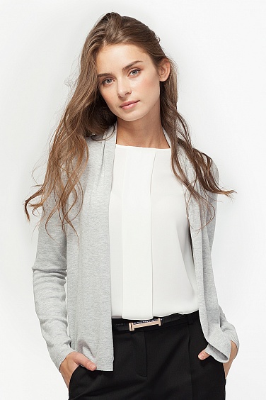 Жакет выполнен из тонкой вискозной пряжи. Спереди широкие планки переходящие в ворот-шаль. По низу рукавов манжет связанный эластичной резинкой.