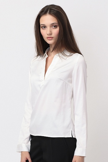 Блузка прямого силуэта, выполнена из эластичной полуматовой атласной ткани. Глубокий v-образный вырез оформлен планкой с отделочной строчкой по краям. По бокам не большие разрезы.