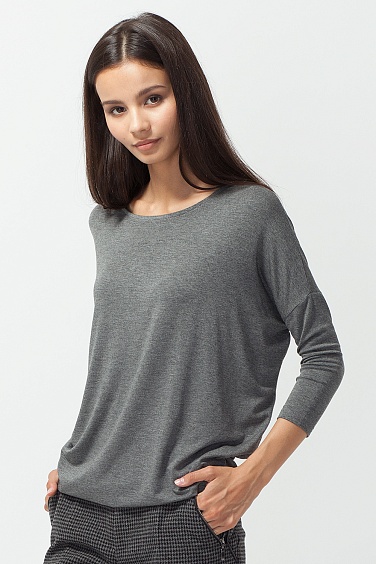 Тонкое вискозное трикотажное полотно. Узкий рукав в спущенной пройме "летучая мышь" длиной 3/4. Свободный силуэт вверху и плотное прилегание на уровне бедер.