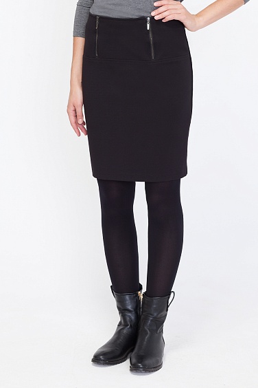 Узкая юбка-карандаш с посадкой на талии, выполнена из качественного, плотного, эластичного джерси.. Широкий пояс-кокетка украшен спереди металлическими молниями. В больших размерах - по колено или немного закрывает колено.