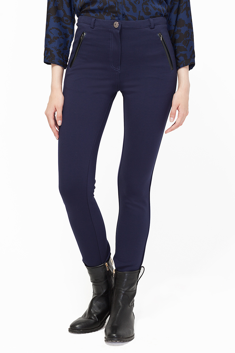 Брюки выполнены из плотного эластичного джерси. Спереди карманы в рамку декорированные искусственной кожей застегиваются на молнию. Сзади ложные карманы в рамку. На поясе шлевки, застежка на молнию и пуговицу.