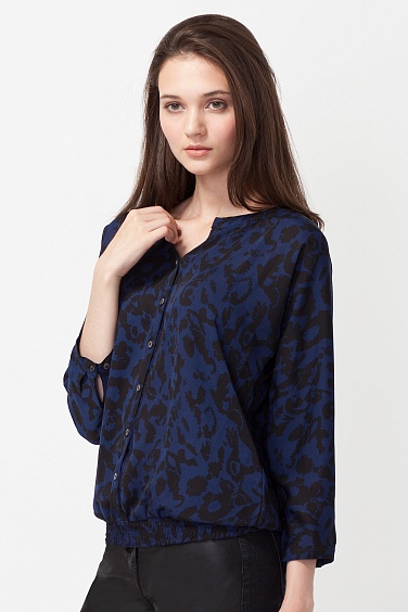 Блузка выполнена из плотной полуматовой атласной ткани с эффектным сине-черным принтом под леопарда. Перламутровые пуговки спереди и на манжетах, рукава 3/4. По низу блузка собрана на несколько эластичных строчек-резинок.