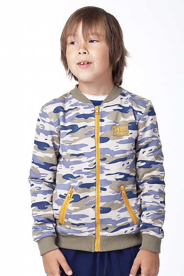 Жакет из принтованного футера с молниями контрастного цвета. На груди нашивка с принтом.