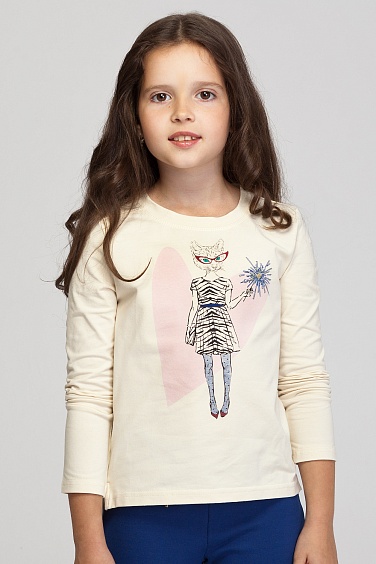 Футболка из хлопкового трикотажа с удлиненной спинкой и открытыми срезами по плечам и горловине. Перед декорирован принтом.