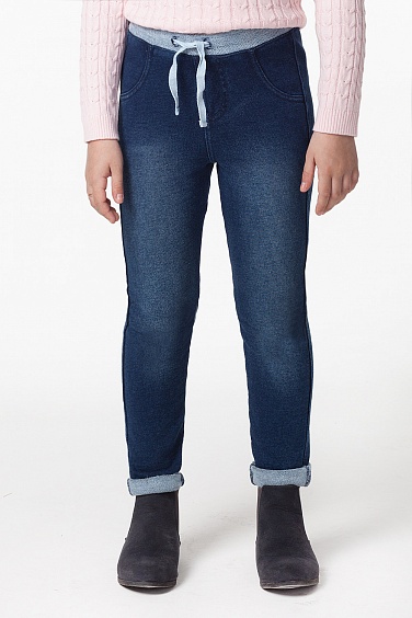 Брюки из эластичного футера по деним с потертостями. Ширина пояса регулируется шнурком.