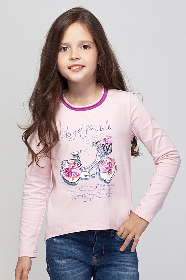 Футболка из хлопкового трикотажа с удлиненной спинкой и горловиной контрастного цвета с открытым срезом. Перед декорирован принтом с глиттером.