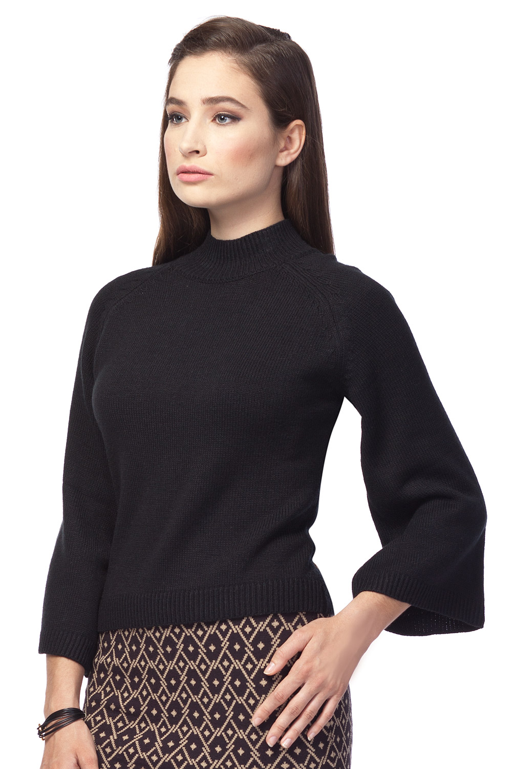 Стильный джемпер тонкой вязки с расширяющимся рукавом 3/4 и плотно прилегающей невысокой горловиной.