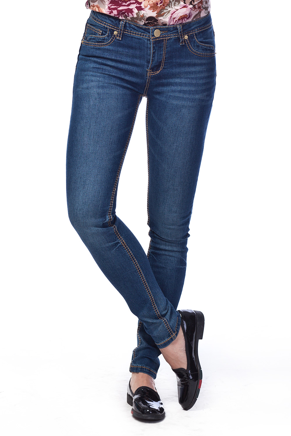 Классические прямые джинсы насыщенного синего цвета. Модель с пятью карманами и декоративными отстрочками контрастного цвета.