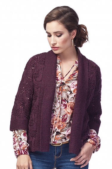 Жакет крупной фактурной вязки выполнен из мягкой пряжи натурального цвета. Силуэт прямой, рукав 3/4, без застежки.