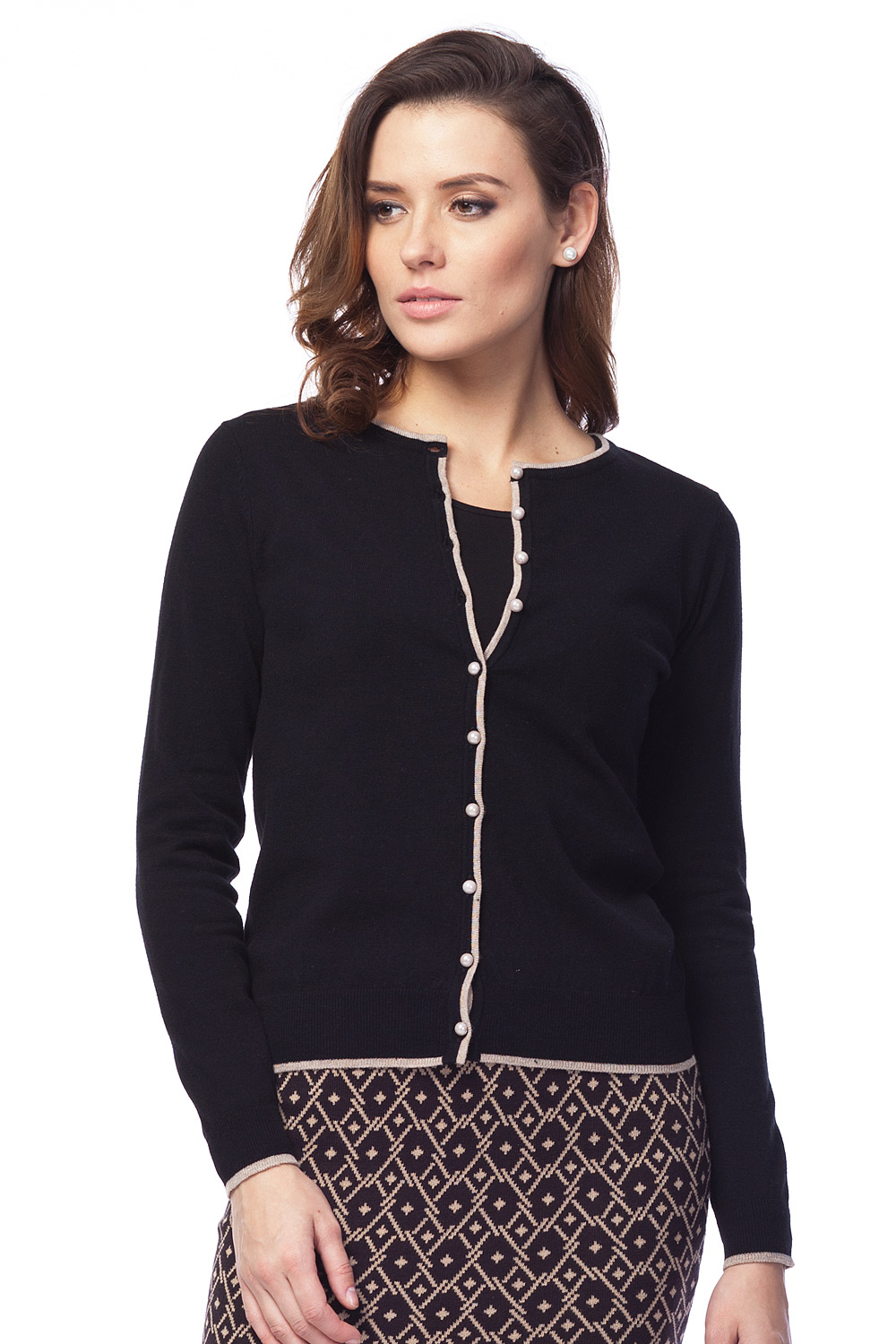 Тонкий классический жакет с контрастными кантами, застёжка на пуговицы. Благодаря небольшому содержанию искусственных волокон не теряет форму, износостойкий.