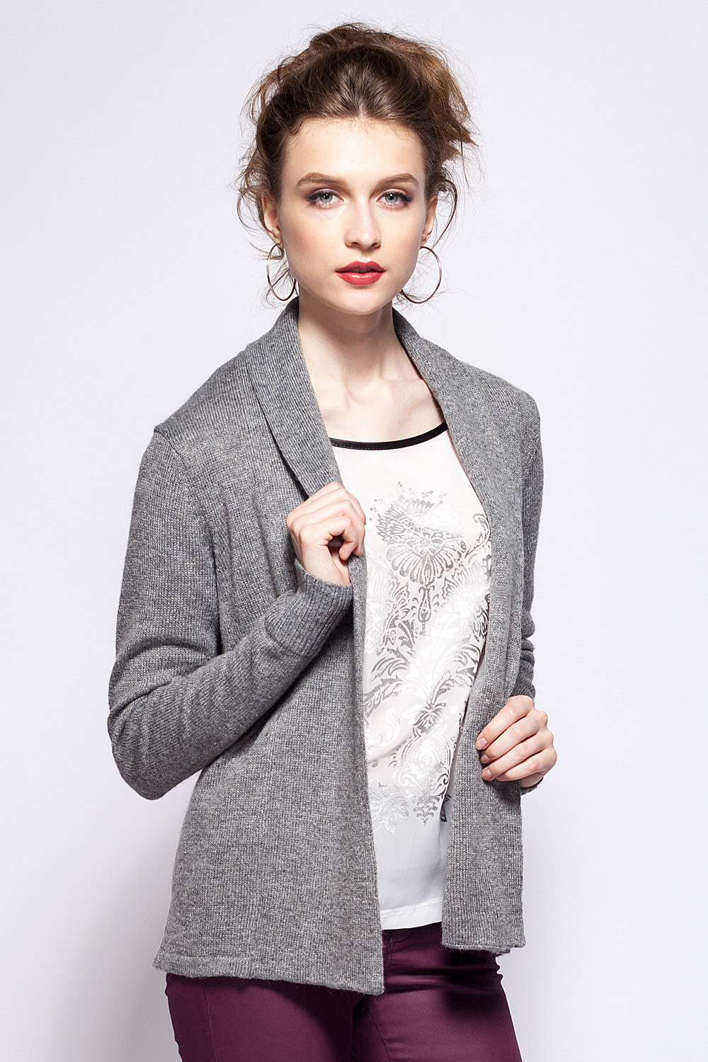 Шерстяной жакет полуприлегающего силуэта без застёжки, имеет отложной воротник и широкие манжеты вывязанные "резинкой"