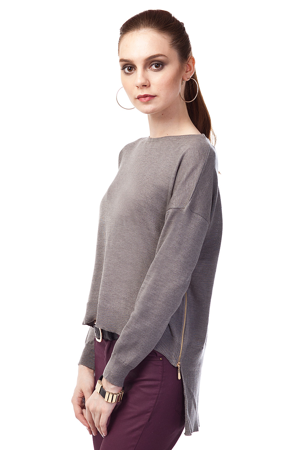 Ультра-модный ассиметричный джемпер мелкой вязки из пряжи с меланжевым эффектом и содержанием шерсти. Деталь переда укорочена, внизу боковых швов небольшие декоративные замки-молнии. Вся фурнитура благородного золотистого оттенка.