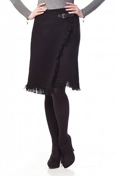 Тёплая юбка ассиметричного А-образного силуэта актуальной длины "миди" с запахом. Изделие выполнено из фактурной ткани, низ и передний кант декорированы бахромой из основной пряжи. В левой части регулируемая застёжка из искусственной кожи.