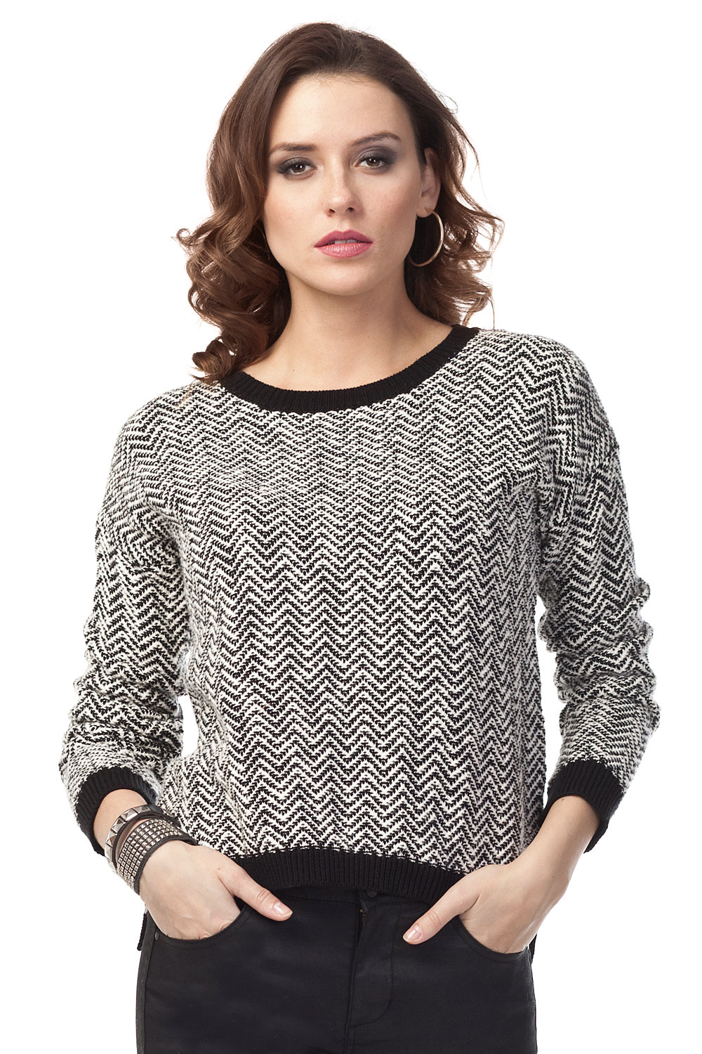 Джемпер свободного силуэта с длинным рукавом , контрастным воротом и манжетами. Модель выполнена с применением факутрной вязки " в ёлочку".