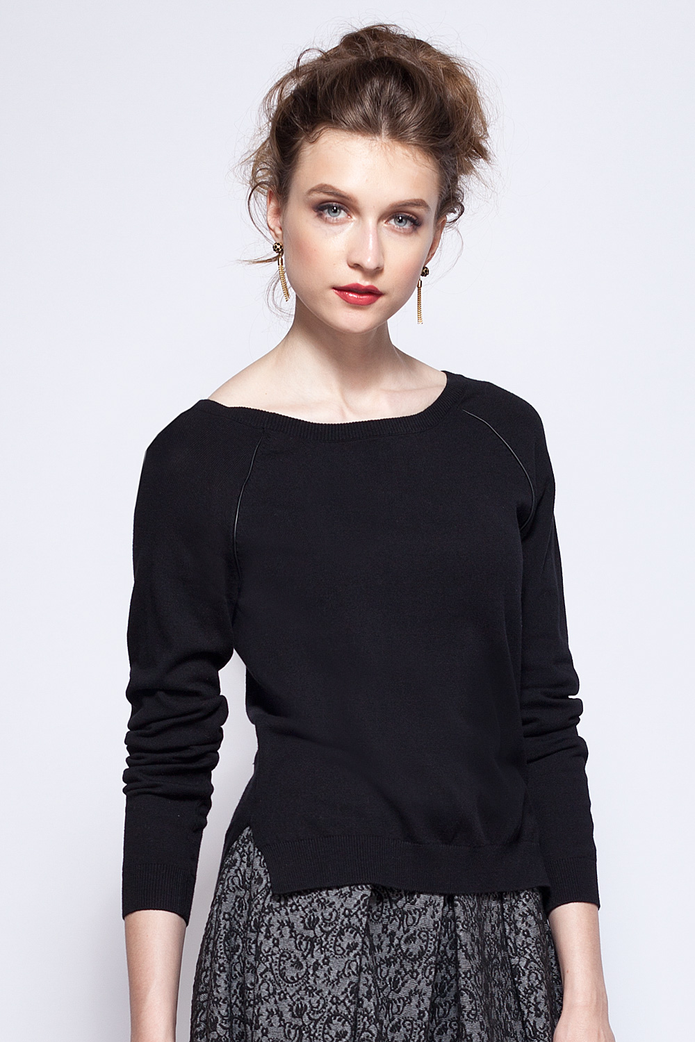 Романтичный джемпер ттонкой вязки с рукавом реглан. По линии втачивания рукава декорирован кантом из искусственной кожи. Вырез-капелька на спинке декорирован небольшим аккуратным бантом из искусственной кожи