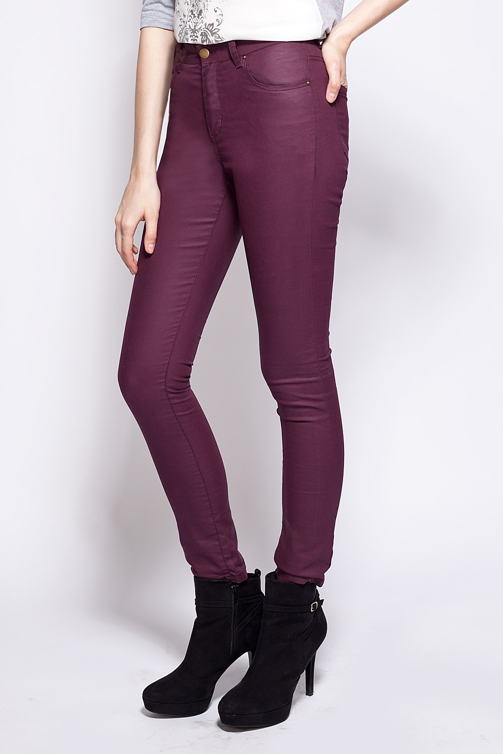 Брюки из эластичной хлопковой ткани джинсового плетения со специальным покрытием снаружи, имитирующим матовую кожу.
