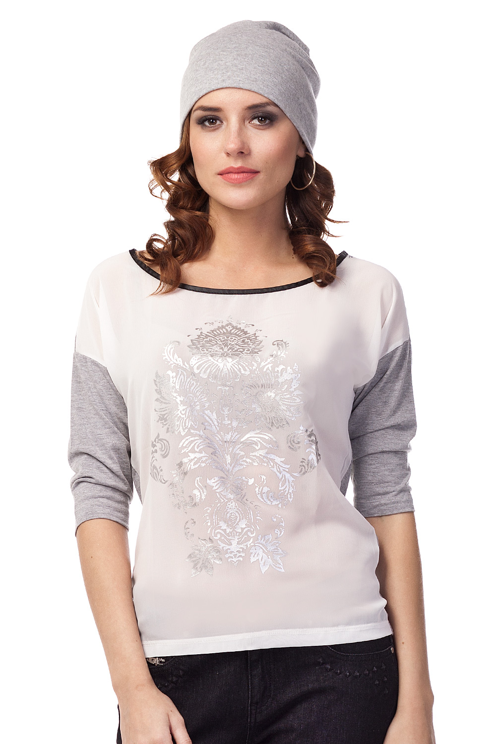 Футболка с принтованной передней частью и рукавом 3/4. Передняя часть декорирована блестящим принтом, спинка и рукава - трикотажные.Вырез декорирован кантом из искусственной кожи контрастного оттенка.