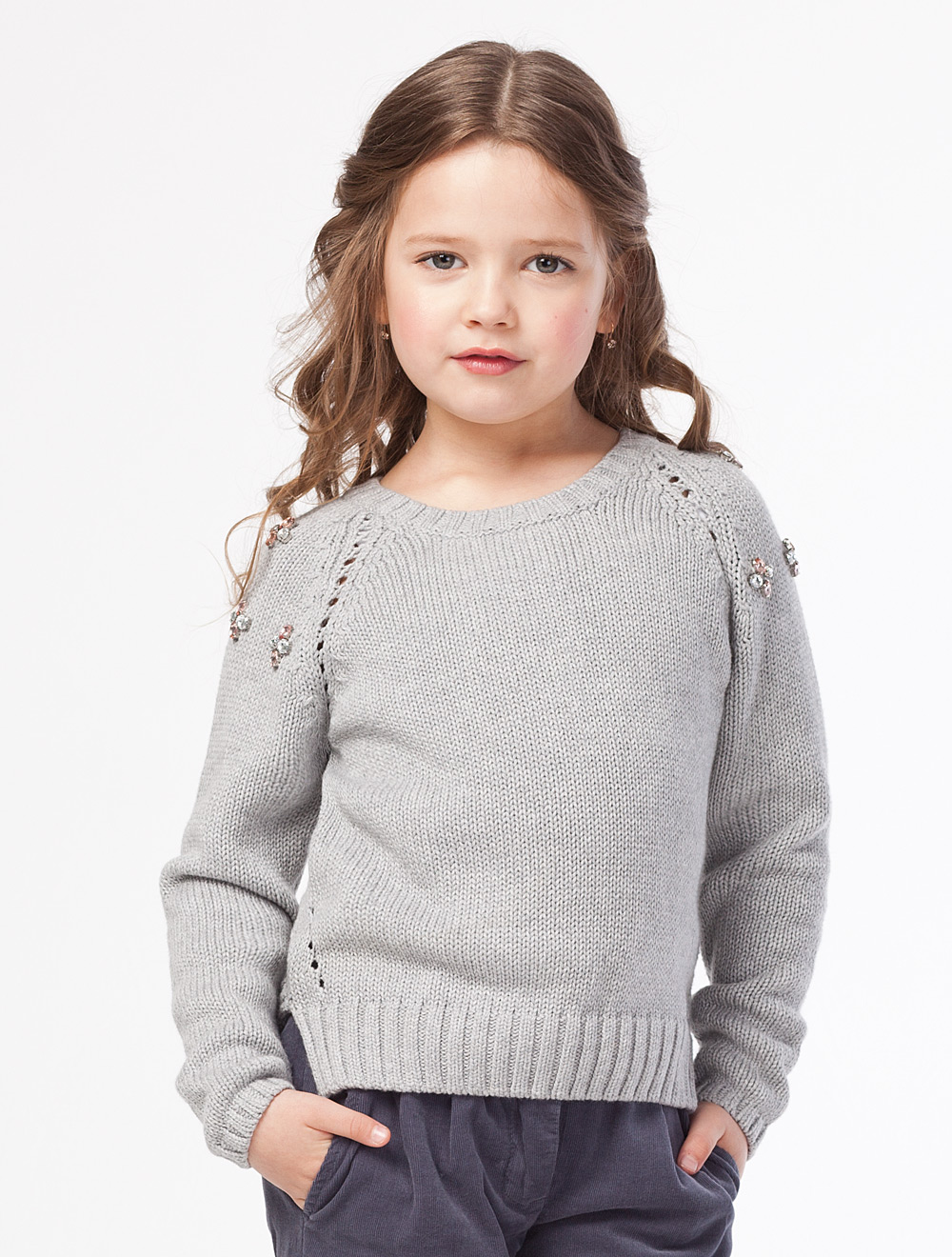 Описание: Джемпер из мягкой хлопковой пряжи со стразами на плечах. По бокам разрезы, перед короче спинки.