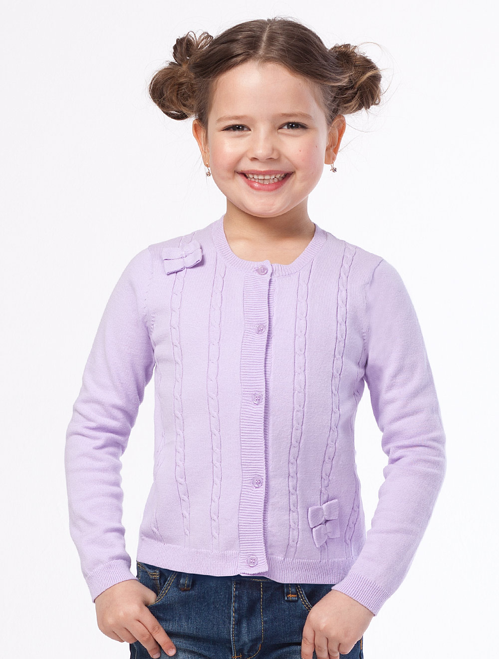 Описание: Жакет тонкой вязки. Передняя часть вывязана рисунком "косы" и декорирована бантиками. Горловина, планка, низ изделия и рукавов выполнены вязкой "резинкой".
