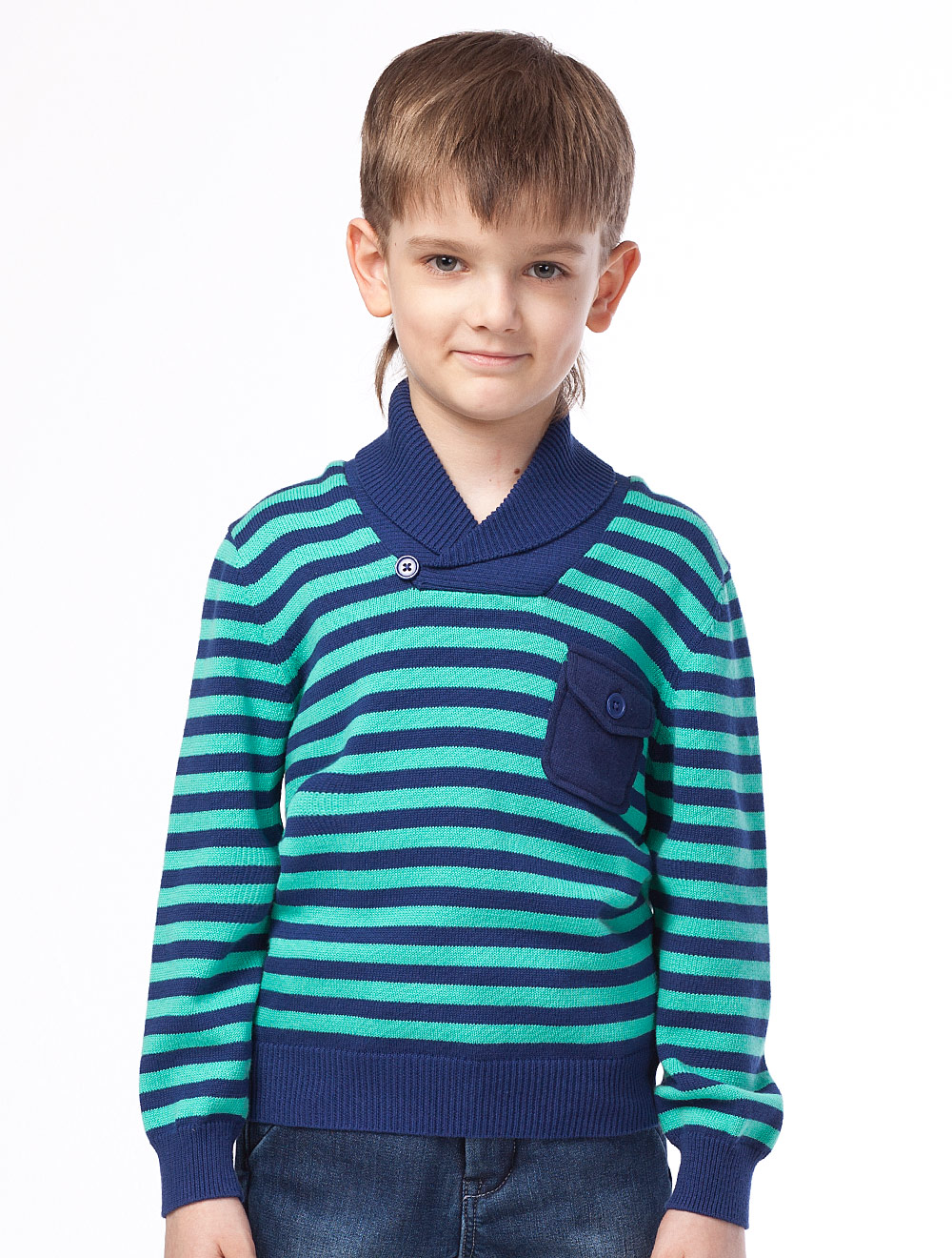 Описание: Джемпер для мальчика с накладным карманом на груди. Воротник застегивается на пуговицу.