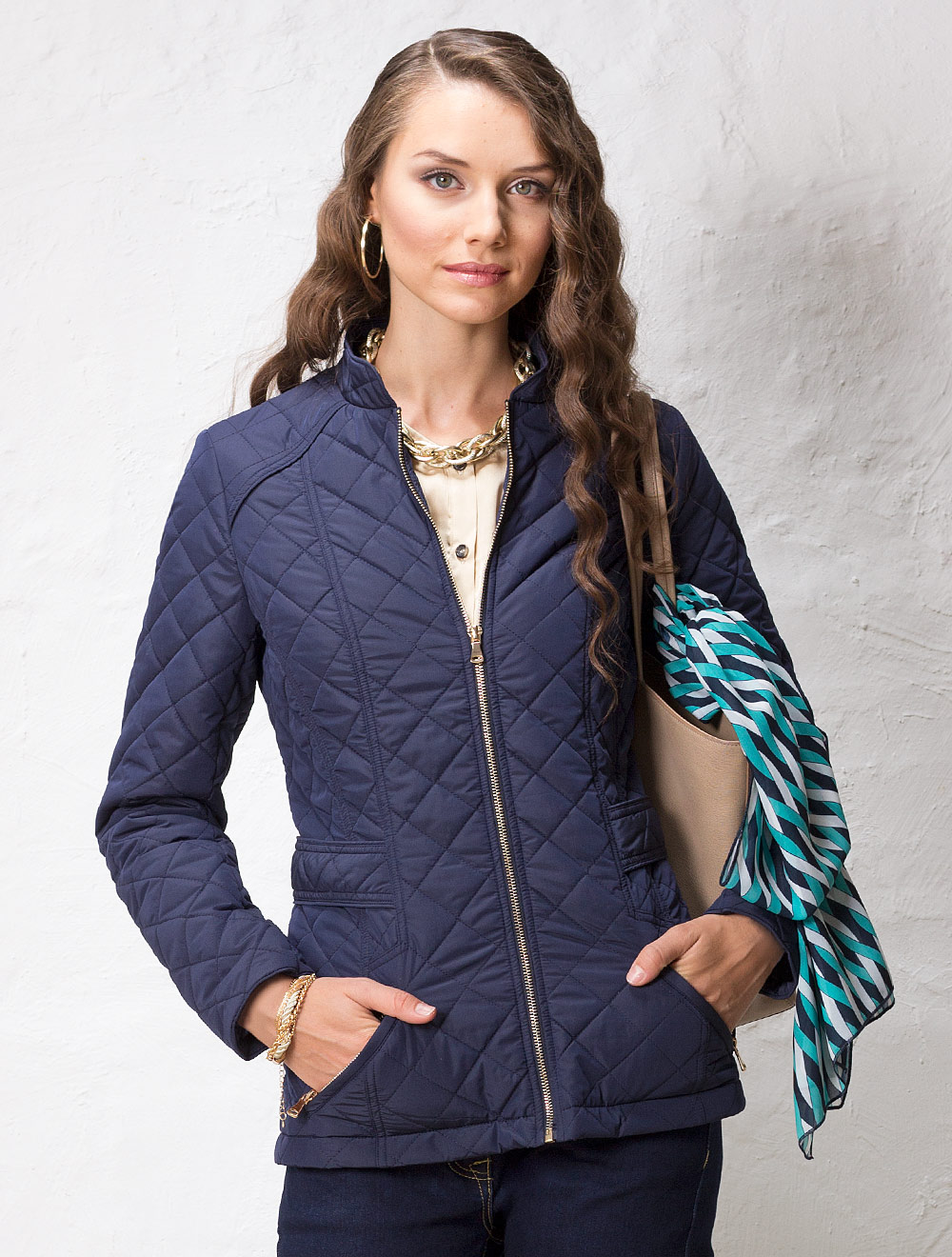Описание: Стеганая куртка приталенного силуэта. Наполнитель - тонкий синтепон. Застежка переда и карманов на золотистые молнии. Уровень облегания по талии регулируется патами при помощи 2 положений кнопок на спинке.