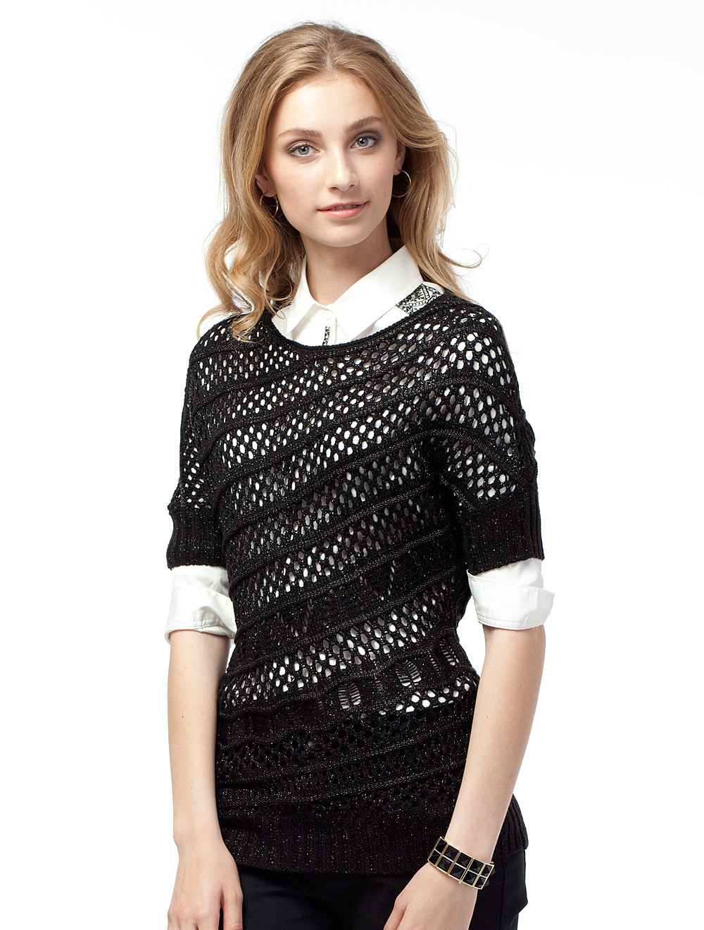 Описание: Резная вязка средней плотности из атласных нитей с элементами черного мягкого люрекса. Ассиметричная форма кроя позволяет формировать эффектные фалды от талии к бедрам. Подходит для многослойных дневных образов или самостоятельно - как вечерний вариант.