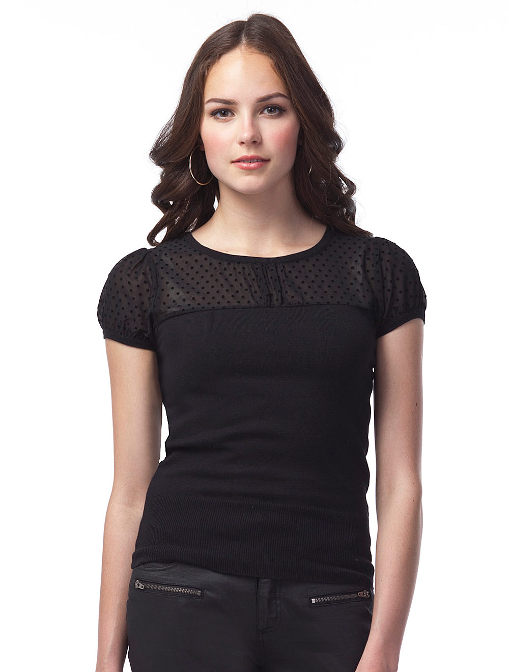 Описание: Перед и спинка выполнены из тонкой хлопоковой вязки. Верхняя часть и рукава-фонарики из шифона с нанесением мелкий горошек бархатной фактуры.