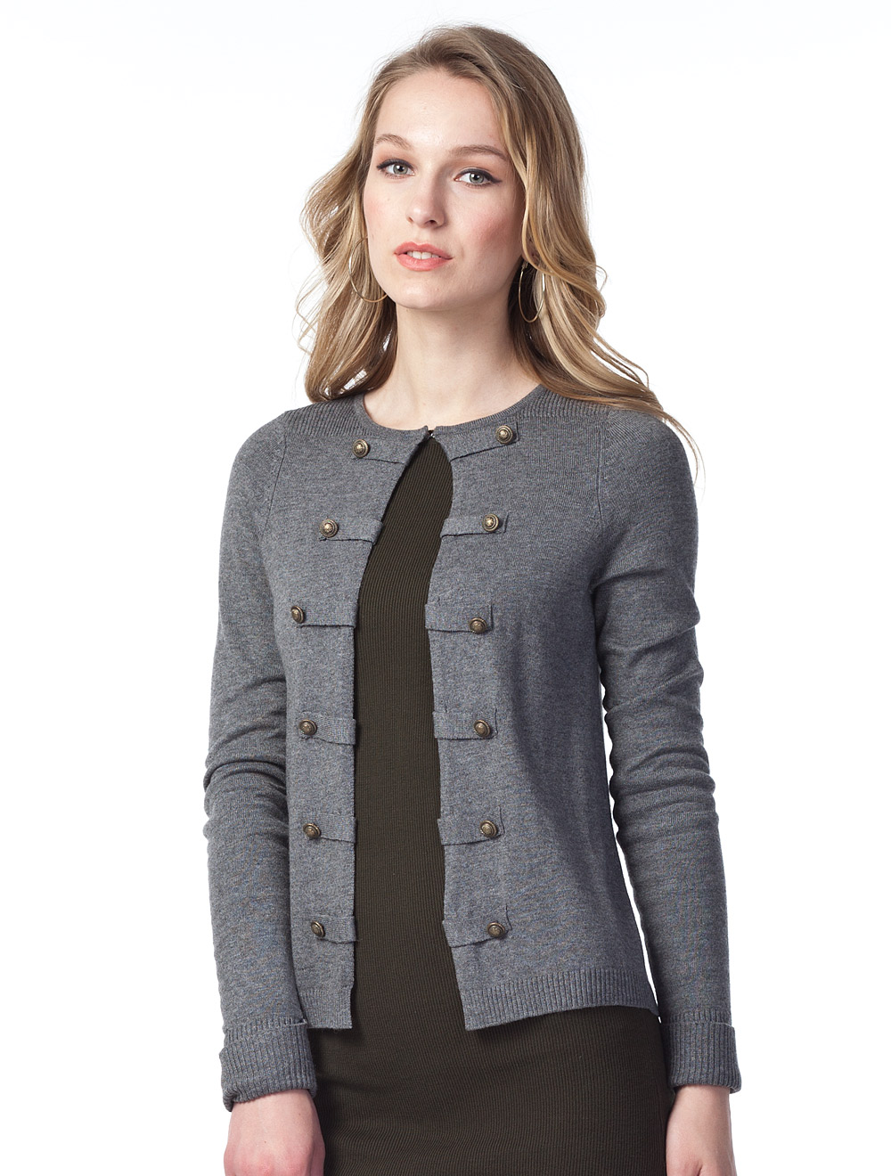 Описание: Тонкая вискозная вязка из серой пряжи с эффектом меланж. Застежка горловины на крючок. Жакет с элементами стиля милитари: борта и манжеты украшены патами с узорными металлическими пуговицами цвета латунь.