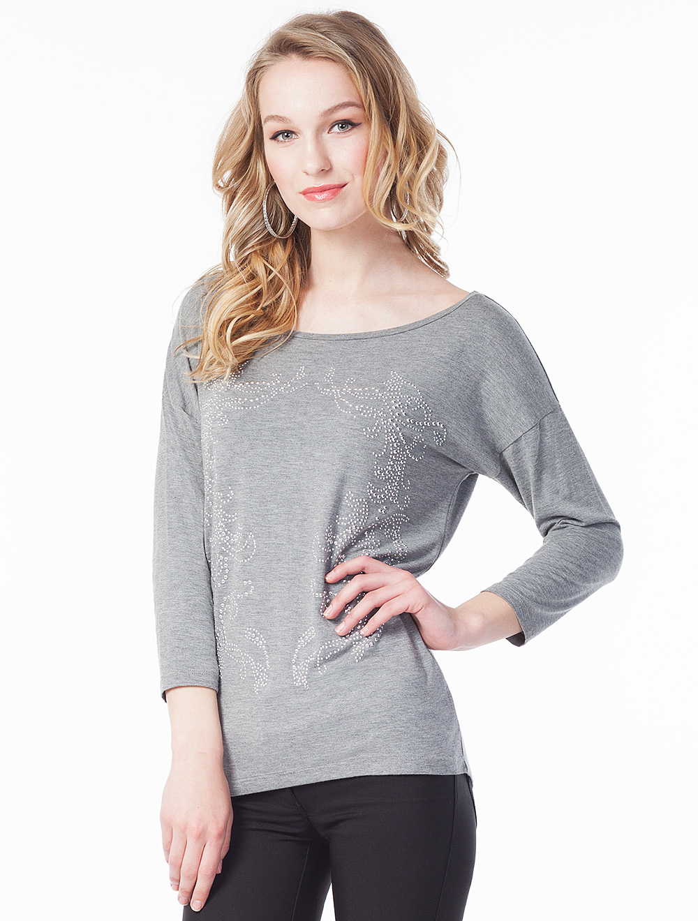 Описание: Мягкий пластичный вискозный трикотаж, спереди джемпер украшен металлического цвета стразами в виде растительного узора.