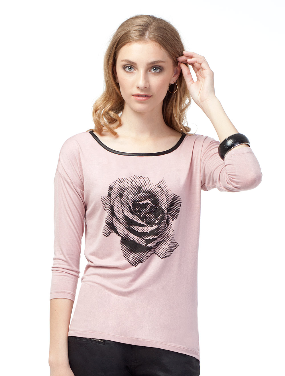 Описание: Тонкая эластичная вискоза. Крой рукава "летучая мышь" со спущенной проймой. Горловина окантована иск кожей. Спереди принт, украшенный стразами.