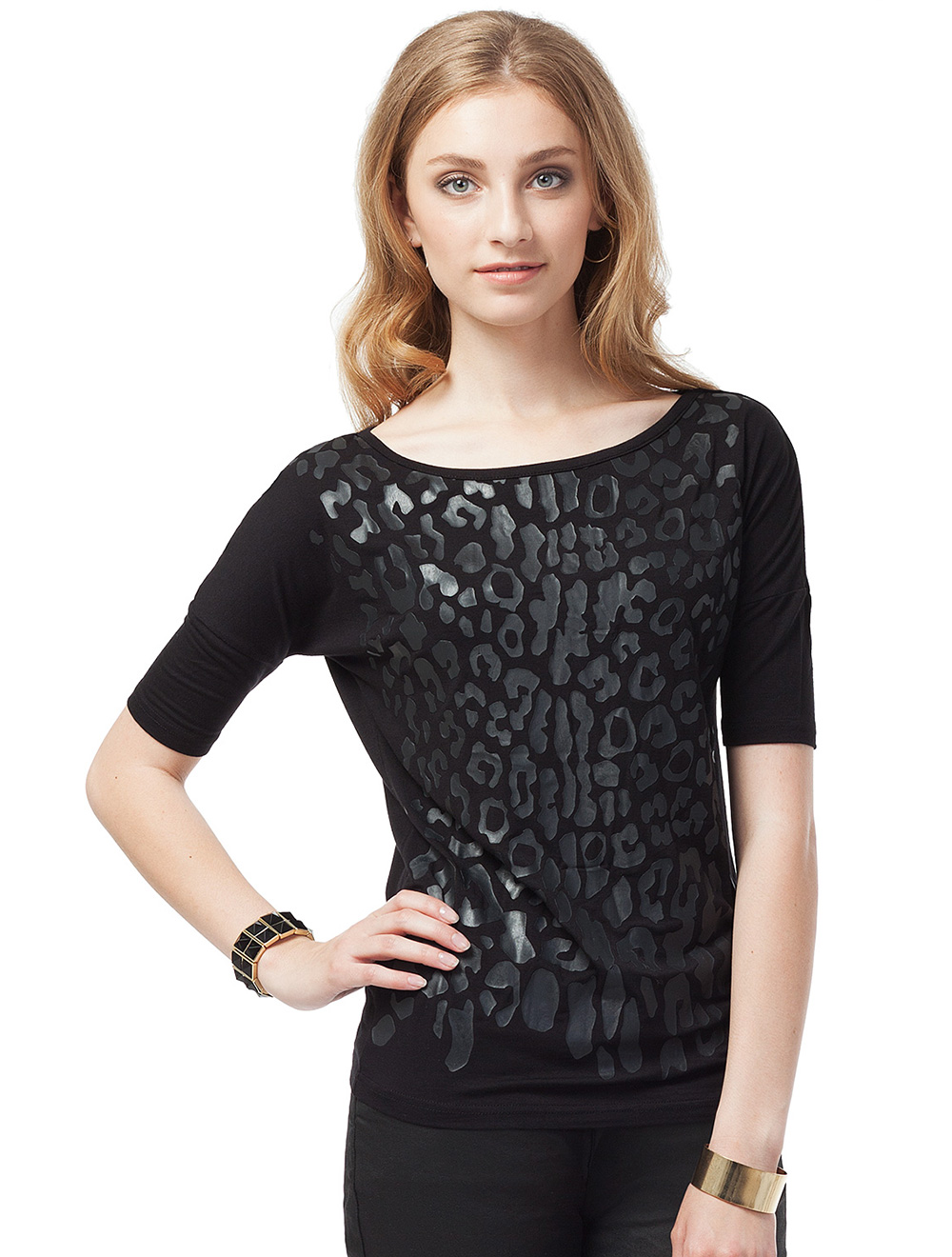 Описание: Тонкое эластичная вискоза. Принт выполнен плотный составом, напоминающим резину и имитирует натуральную кожу. Рисунок принта под шкуру леопарда Узкие рукава 1/2 на спущенной пройме в форм "летучая мышь"