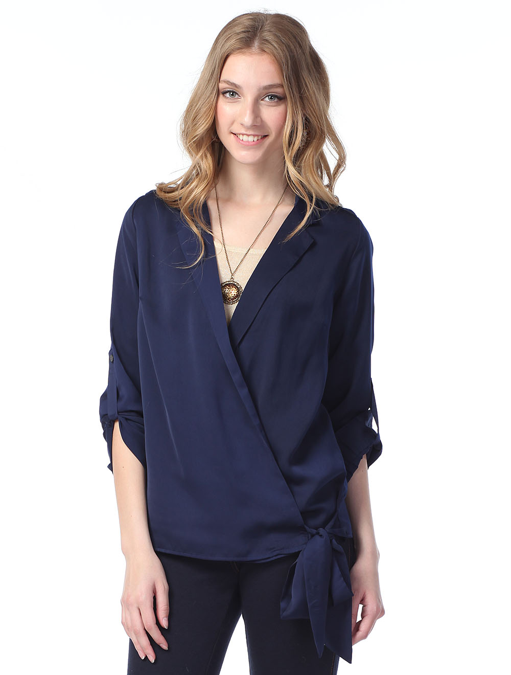 Описание: Блузка-жакет. Выполнена из плотного полиэстера с небольшим матовым блеском. Застежка-запах: внутренняя часть на пуговице, наружная в виде эффектного пояса или банта. Рукава регулируются по длине от длинных до 3/4. На плечах небольшие погоны, воротник с лацканами с глубоким вырезом.