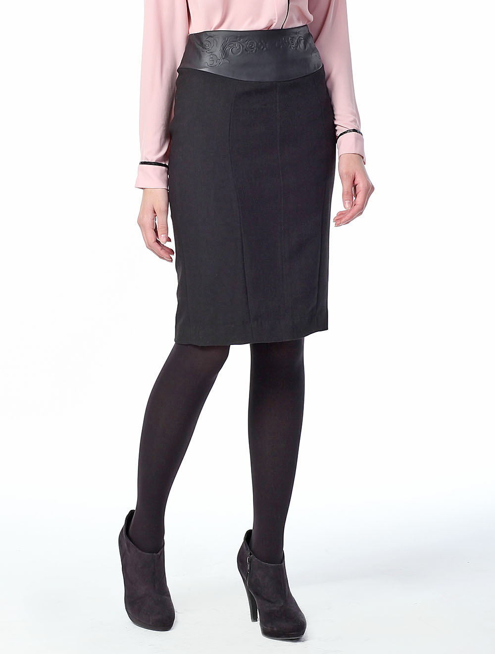 Описание: Юбка-карандаш из плотной классической ткани на подкладке. Застежка на молнии сзади. Пояс оформлен в виде кокетки из иск. кожи с декоративным тиснением.