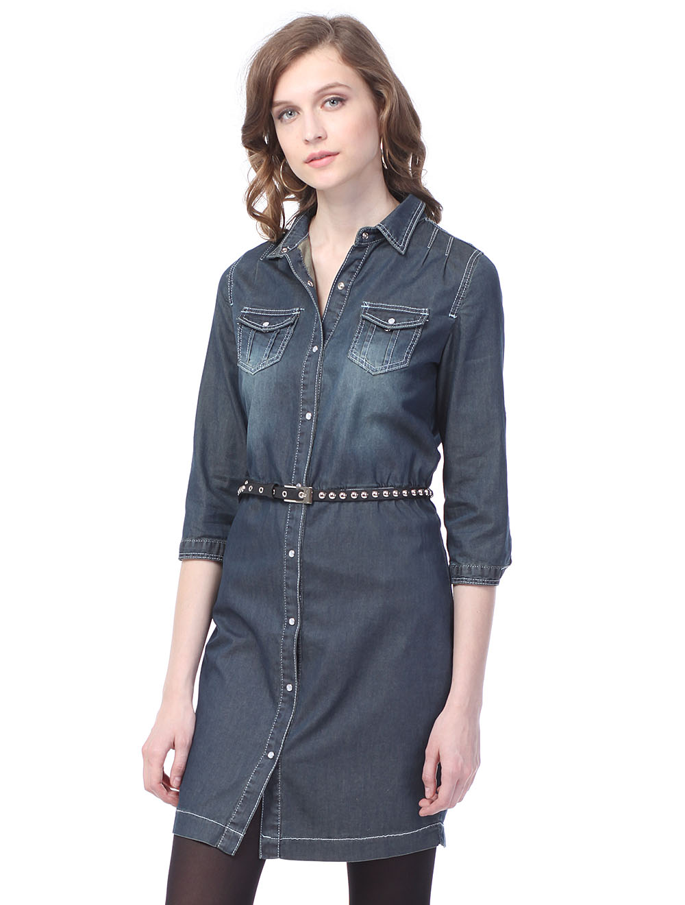 Описание: Платье выполнено из тонкого серо-синего денима с декоративной строчкой серого цвета. Застежка на кнопки с перламутровой шляпкой. Талия собрана узкую резинку. Рукава 3/4 с узким манжетом и возможностью отворота и крпления на паты. В больших размерах длина платья за колено