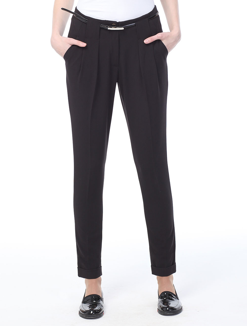 Описание: Укороченные и зауженные к низу брюки с манжетом внизу. Выполнены из тонкой классической поливискозы. Перед оформлен широкими шлевками, переходящими в защипы и стрелки.