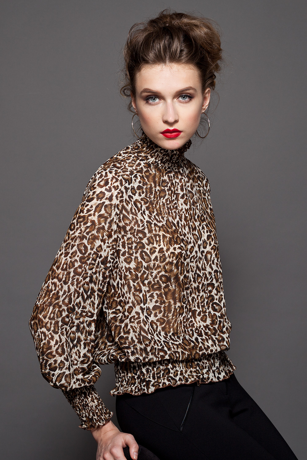 Лёгкая сексуальная блузка из полупрозрачной ткани. Высокий воротник, широкие манжеты и низ изделия со сборками на резинке. Застёжка на небольших пуговицах, на спинке небольшой узкий вырез.