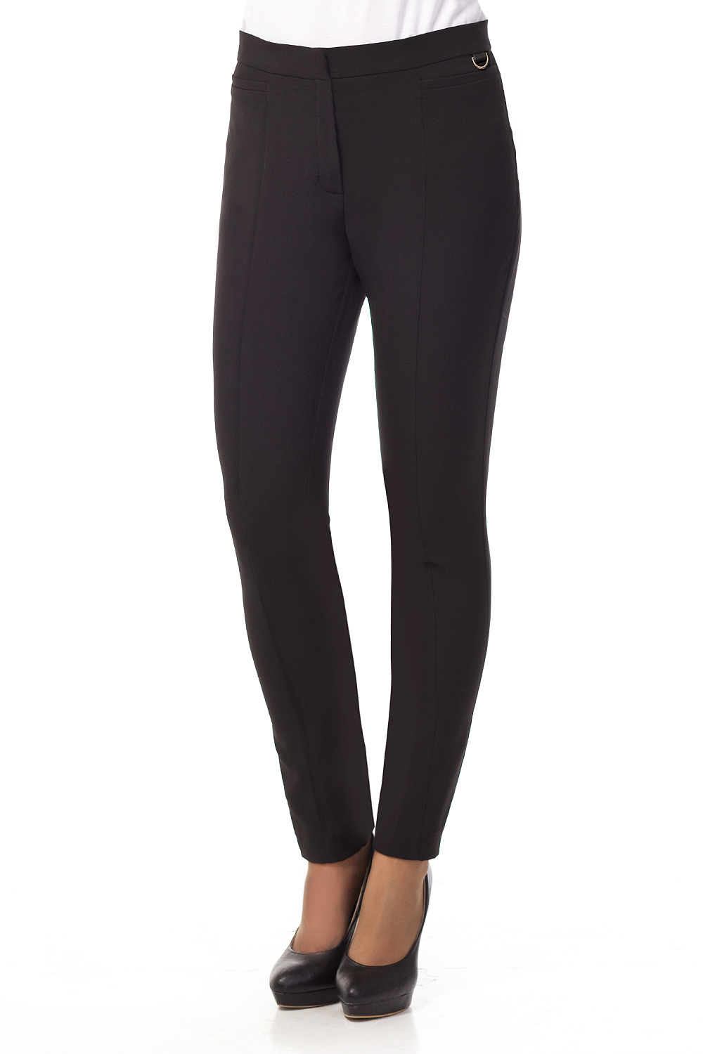 Брюки из эластичной классической ткани облегающего силуэта. Акцентом являются отделочные строчки по центру ноги спереди. Пояс спереди украшен полукольцом золотистого цвета. Задний карман-листочка украшен металлическим логотипом.