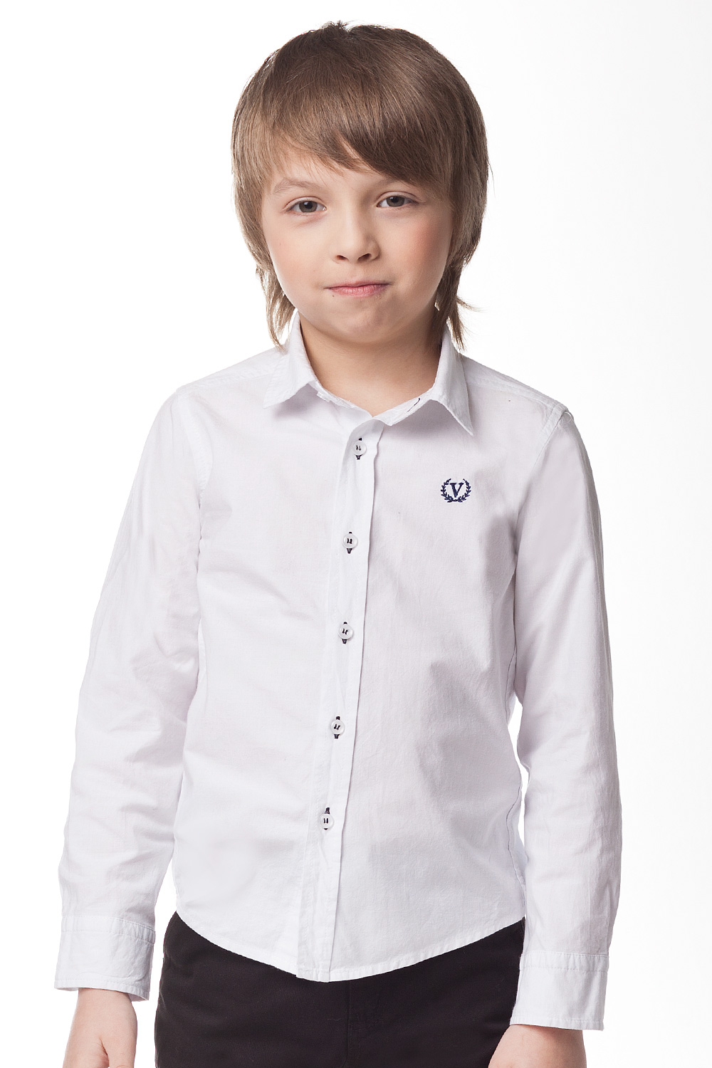 Сорочка из хлопка с эффектом стирки. Петли для пуговиц обработаны нитками контрастного цвета. На груди вышивка.