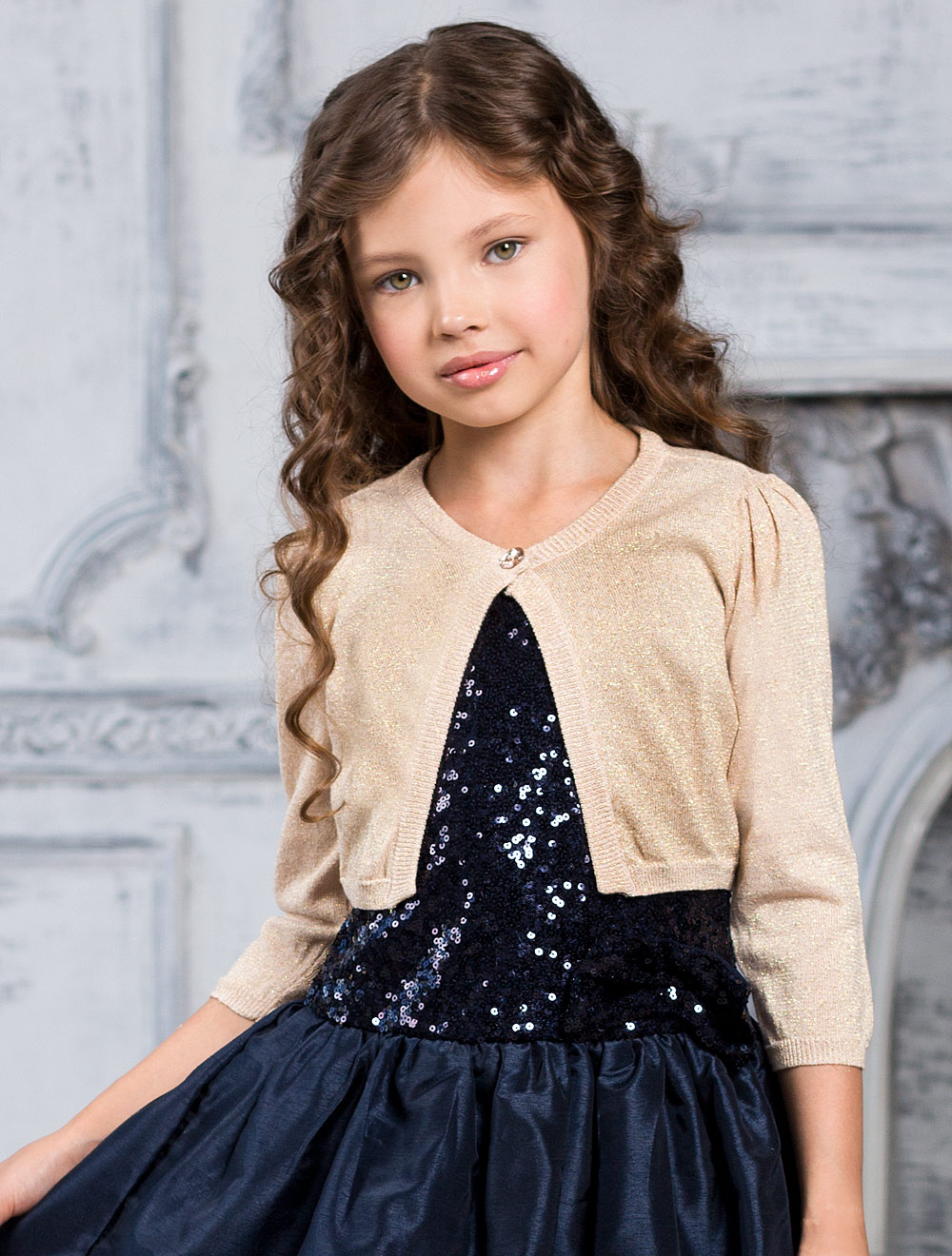 Описание: Вязаный жакет с люрексом, рукав со сборкой в верхней части. Застежка на декоративную пуговицу.