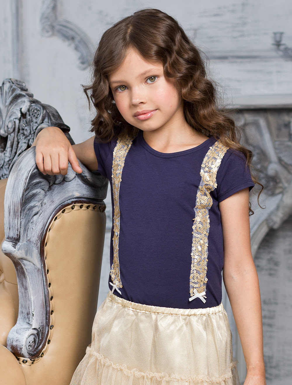 Описание: На передней и задней части футболки ленты из сетки, вышитые пайетками