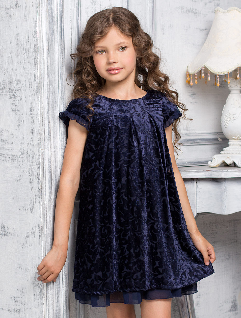 Описание: Мягкий бархат, расположенный на шифоне в виде узоров из цветов. Рукава-фонарики с рюшей по низу из шифона. Верхняя часть платья декорирована тремя застроченными складками. Платье на трикотажной подкладке с оборкой из шифона по низу.