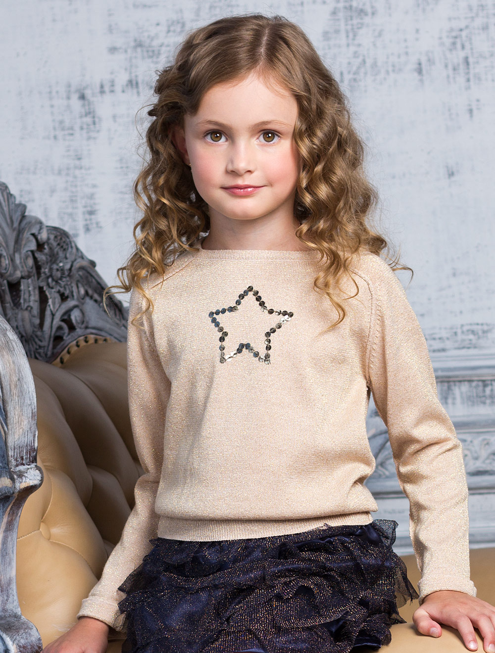 Описание: Вязаный джемпер с золотым люрексом, на локтях аппликация из иск. кожи золотистого цвета, спереди вышивка-"звезда", выполненная пайетками